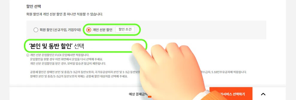 ③ 할인 선택 시 '개인 신분 할인'을 클릭하여 할인된 금액으로 결제합니다.