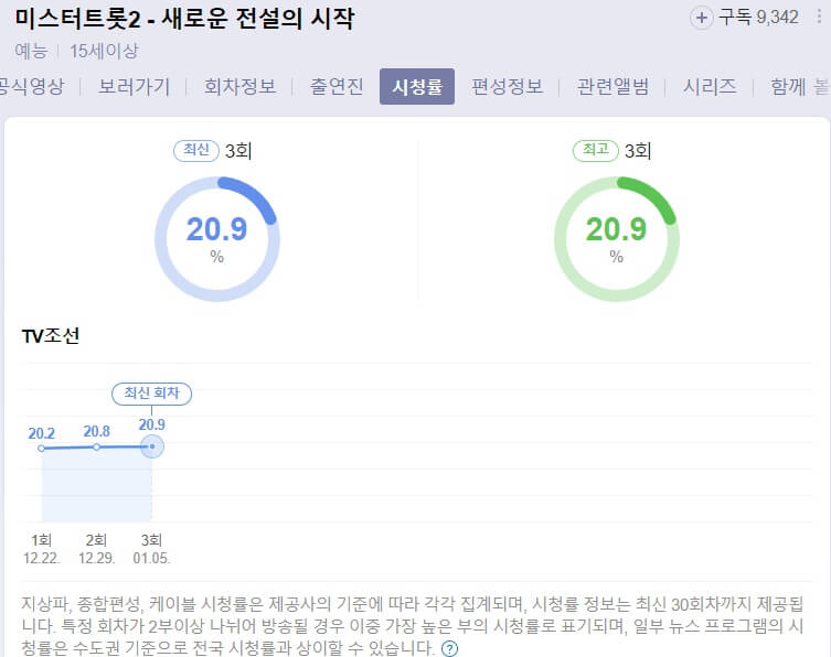 미스터트롯2은 매 방송마다 시청률 20%를 넘기고 있습니다. 앞으로 얼마나 더 높아질지 기대가 되네요. 3회에선 자체 시청률 최고 기록을 넘겨 20.9%를 달성했습니다.
